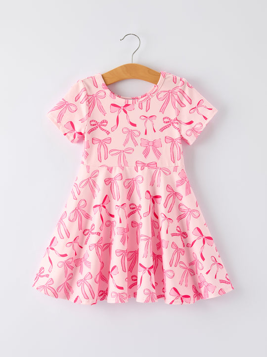 Girls Pink Dress with Bow Pattern - Cute Short Sleeve Outfit