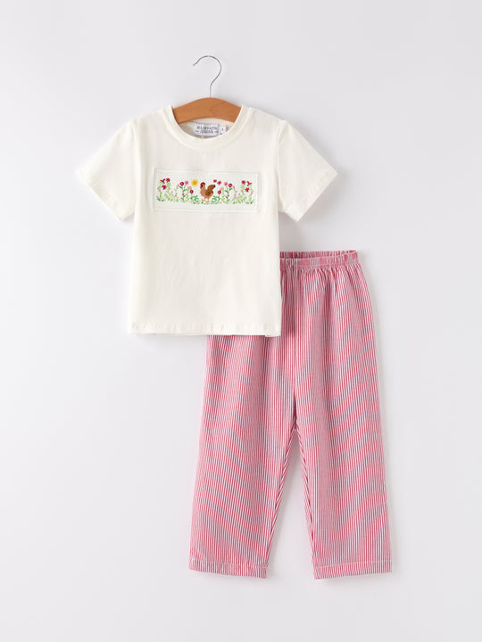 Fall Thanksgiving Chicken Smock Embroidered Green Plaid Boys 'Set