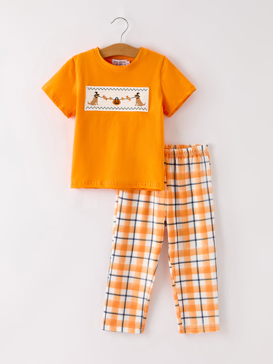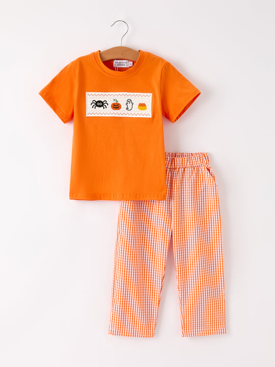 Fall Halloween Orange Pumpkin Ghost Spider Smock Embroidery Boy Set