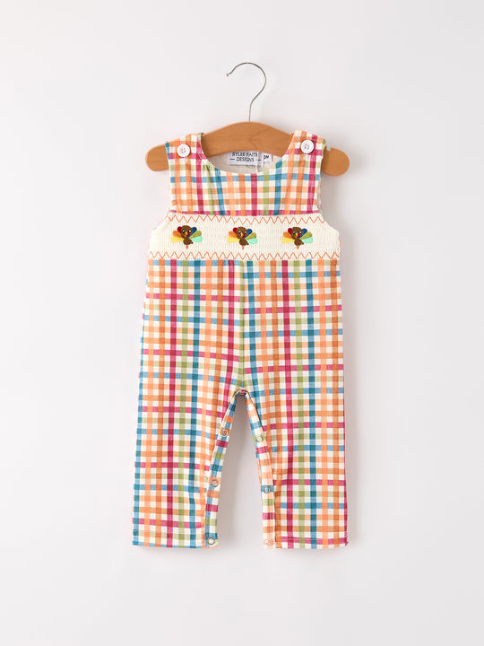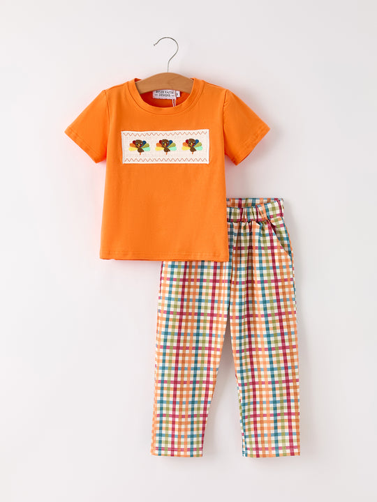 Fall Thanksgiving Apricot Plaid Turkey Embroidery Smocking Boys Set
