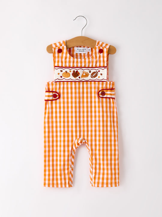 Fall Turkey Embroidered Romper for Baby Boys – Orange Checkered with Halloween Details