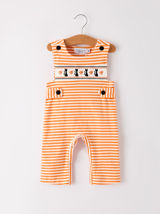 Halloween Striped Baby Boys Romper with Cat Smocking Embroidery – Perfect for Fall