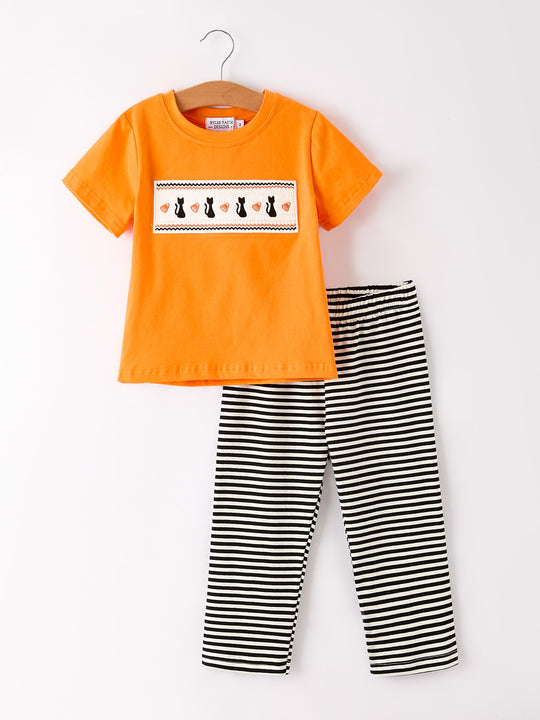 Halloween Striped Boy Set with Cat Smocking Embroidery – Perfect for Fall