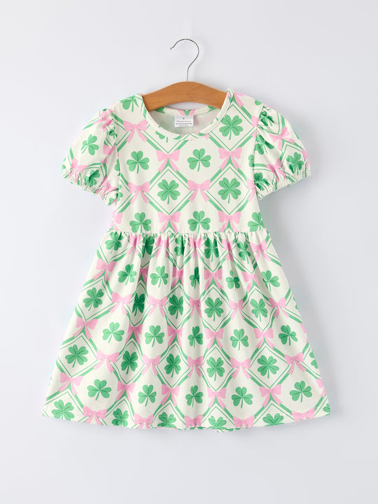 St. Patrick's Day Bow Shamrock Print Short Sleeves Girls Dress