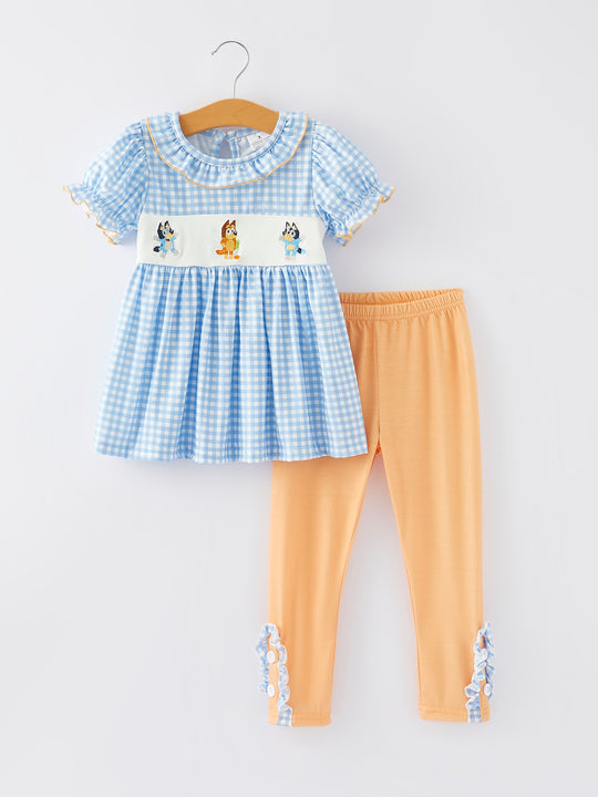 Cartoon Plaid Embroidered Girls Pants Outfit Set
