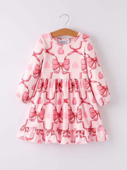 Fall Halloween & Thanksgiving Pumpkin Bow Print Long Sleeve Dress