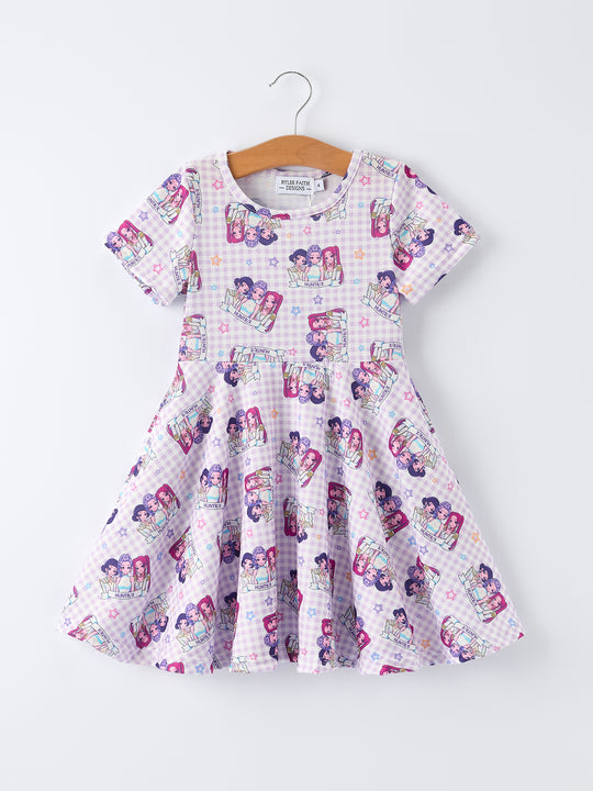 PREORDER Purple Plaid Characters Print Short Sleeve Girls Dress