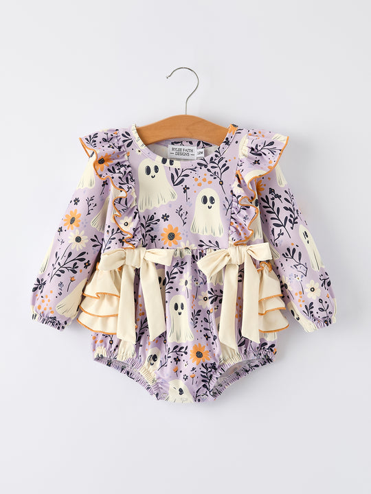 Purple Halloween Ghost Print Baby Girl Romper with Bow Ruffles