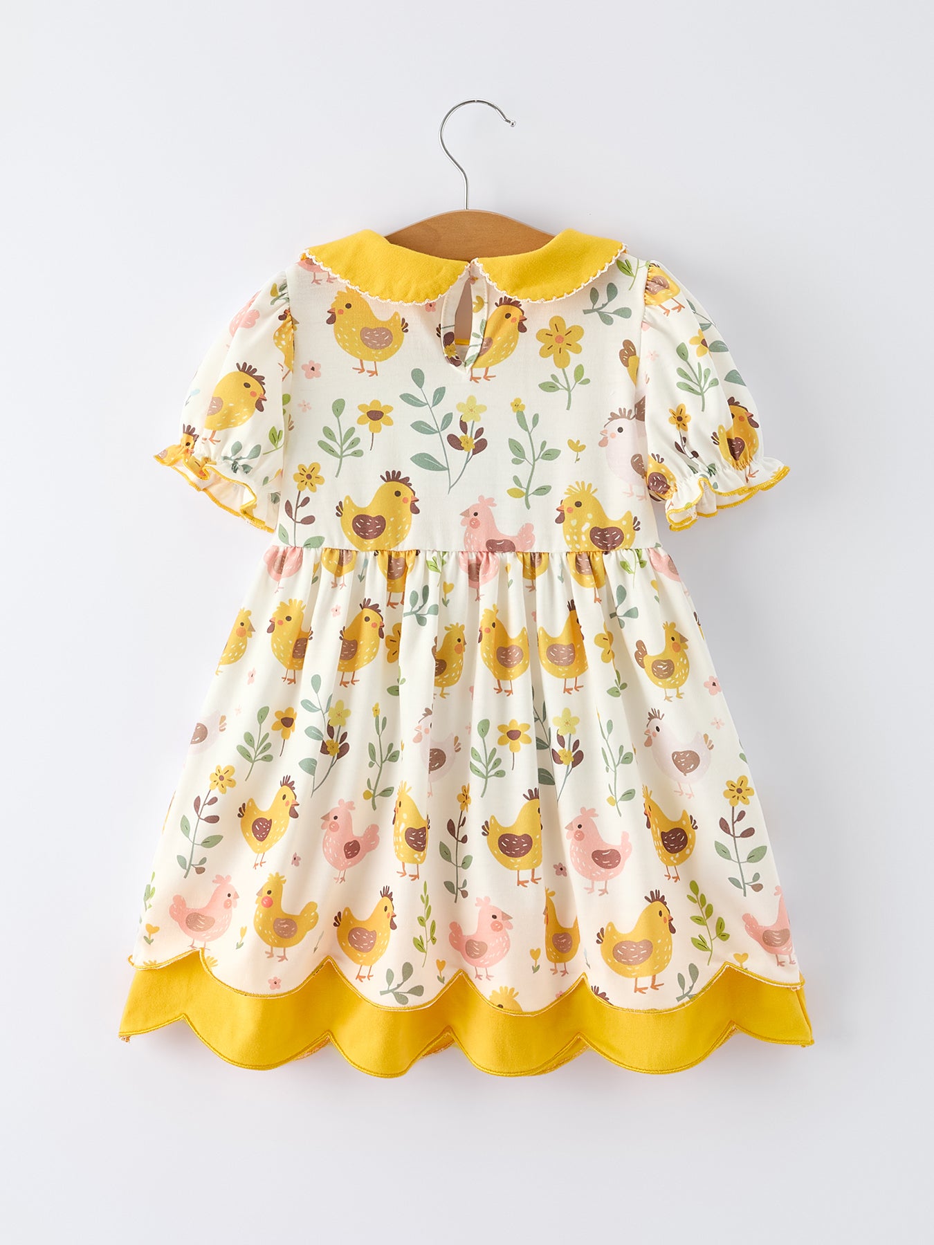 Hop into spring with this adorable Spring Chick Scallop Short-Sleeve Girl Dress. Featuring charming chick designs and delicate scalloped trim, this dress captures the joy of the season in soft, comfortable fabric perfect for holiday celebrations, family photos, and playdates. The short sleeves keep her cool while the playful details make getting dressed fun. An essential addition to any little one's seasonal wardrobe.