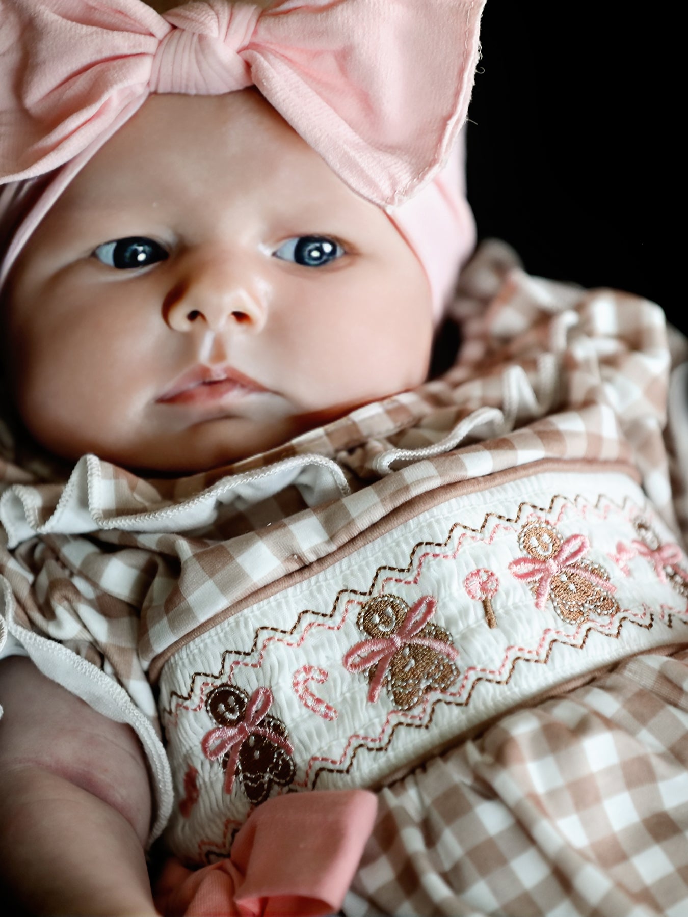 Christmas Vintage-Style Plaid Embroidered Gingerbread and Bows Girls Romper