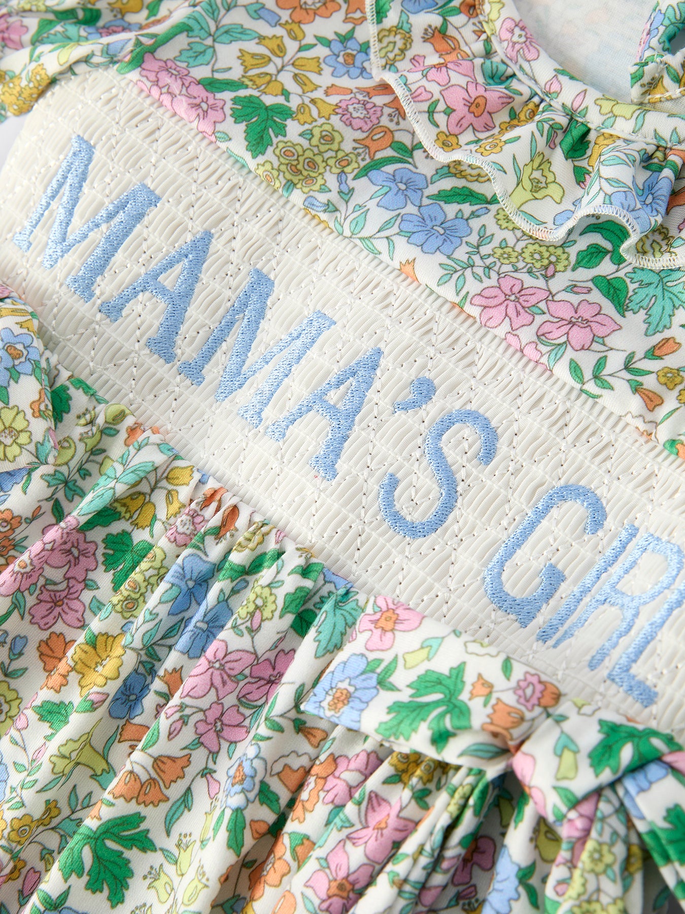 Celebrate the bond between mother and daughter with this beautifully embroidered smocked dress. Featuring delicate "MAMA'S GIRL" lettering and intricate smocking details, this piece combines comfort with timeless elegance. Perfect for everyday adventures or special moments, the quality construction withstands active play while maintaining its charm. A meaningful gift that lets her proudly express her love—a dress she'll treasure wearing.