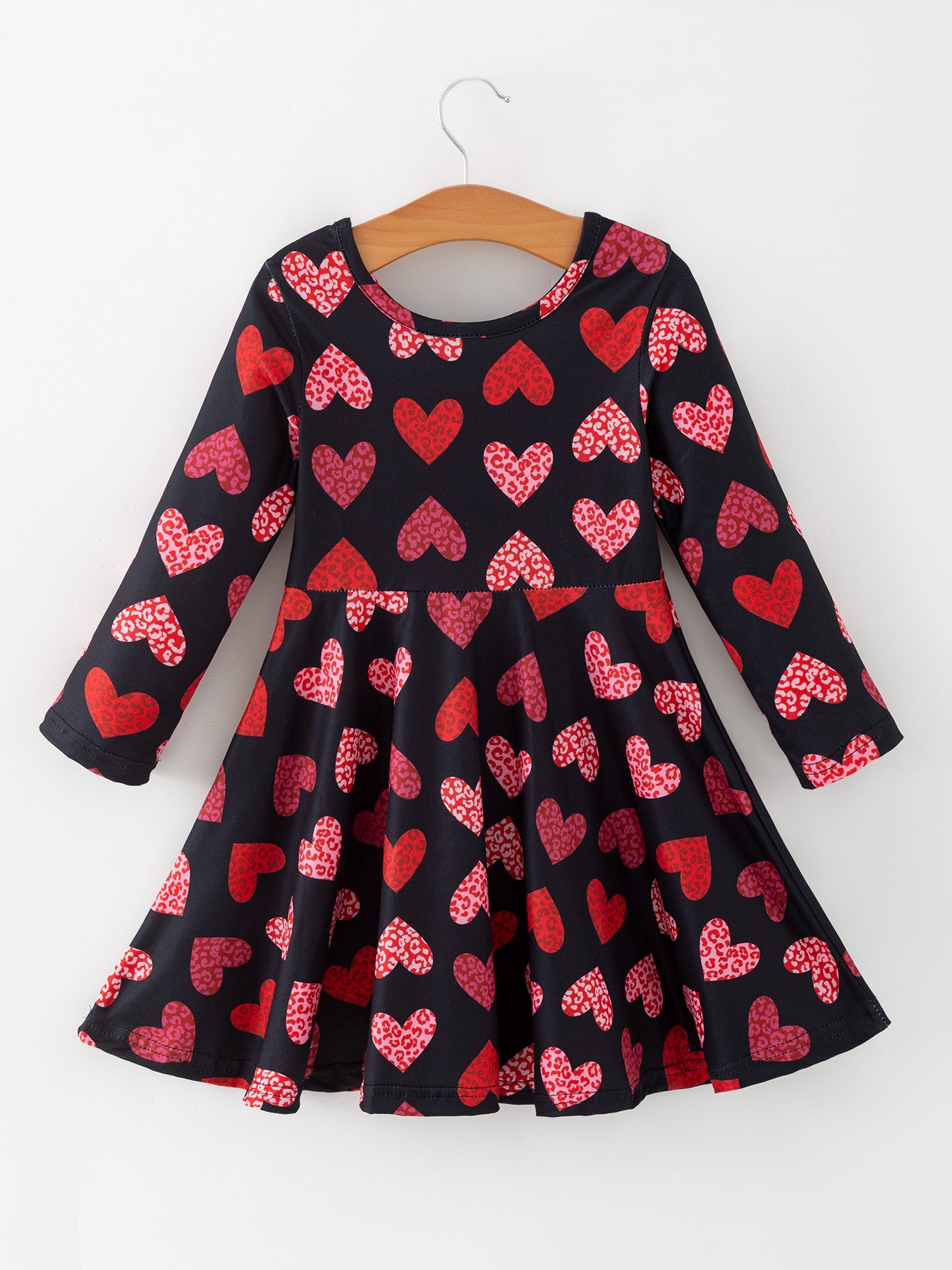 Girls Valentine's Day Black Dress With Leopard Heart Print