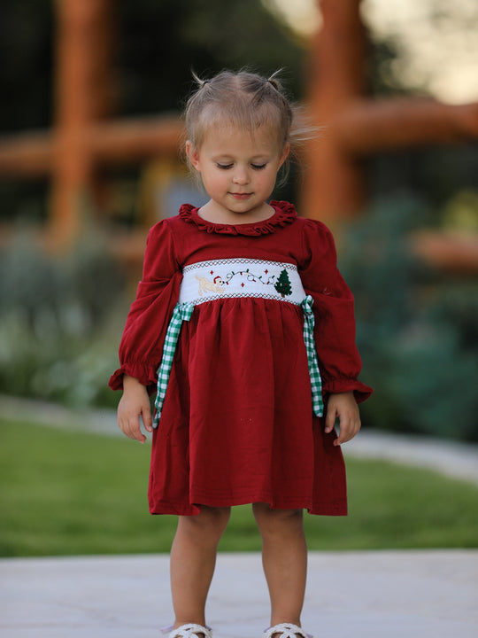 Christmas Smocking Embroidered Girls Dress with Green Plaid Bow