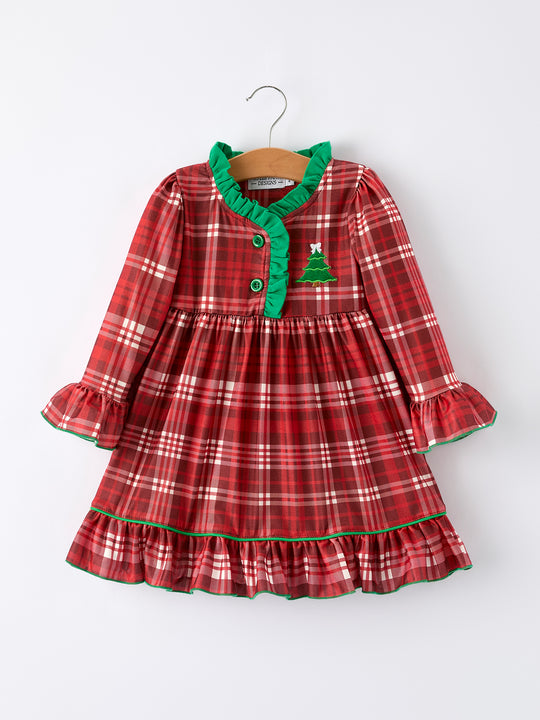 Girls Christmas Plaid Dress with tree Applique and Ruffle Details