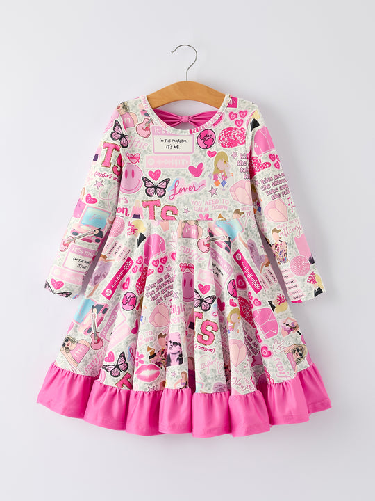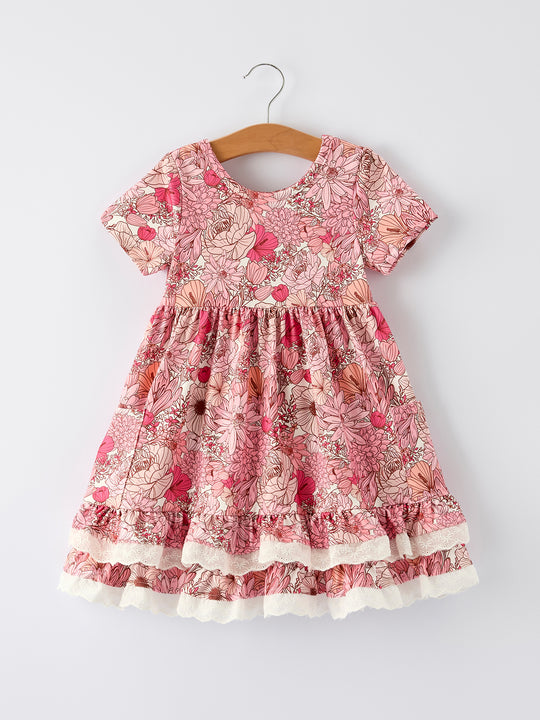 Fall Sweet Floral Pattern Dress with Pockets and Ruffle Hem for Girls