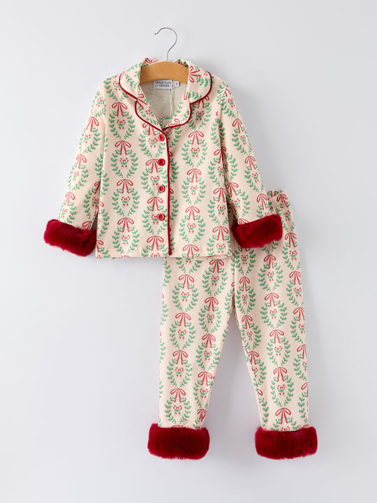 Christmas Long Sleeve Pajama Set with Red Cuffs and Festive Pattern