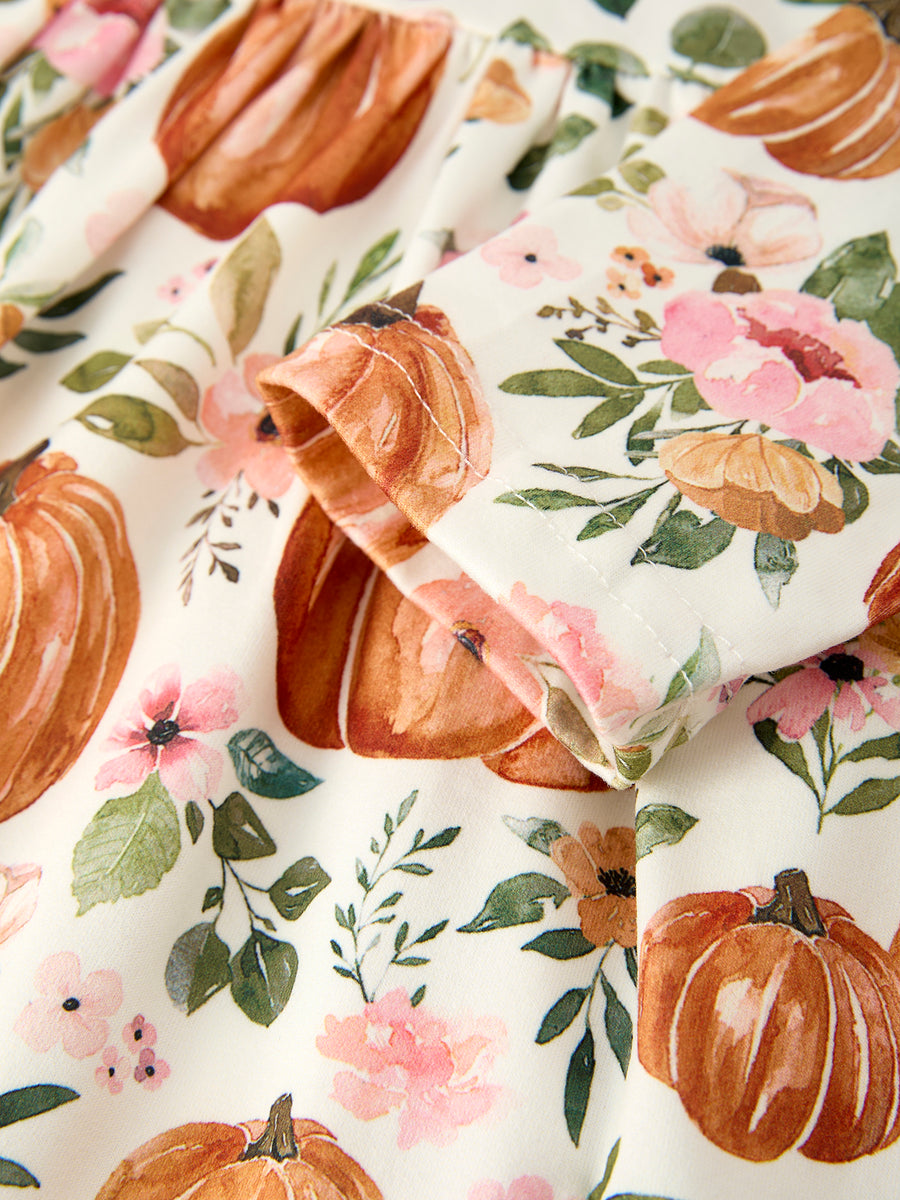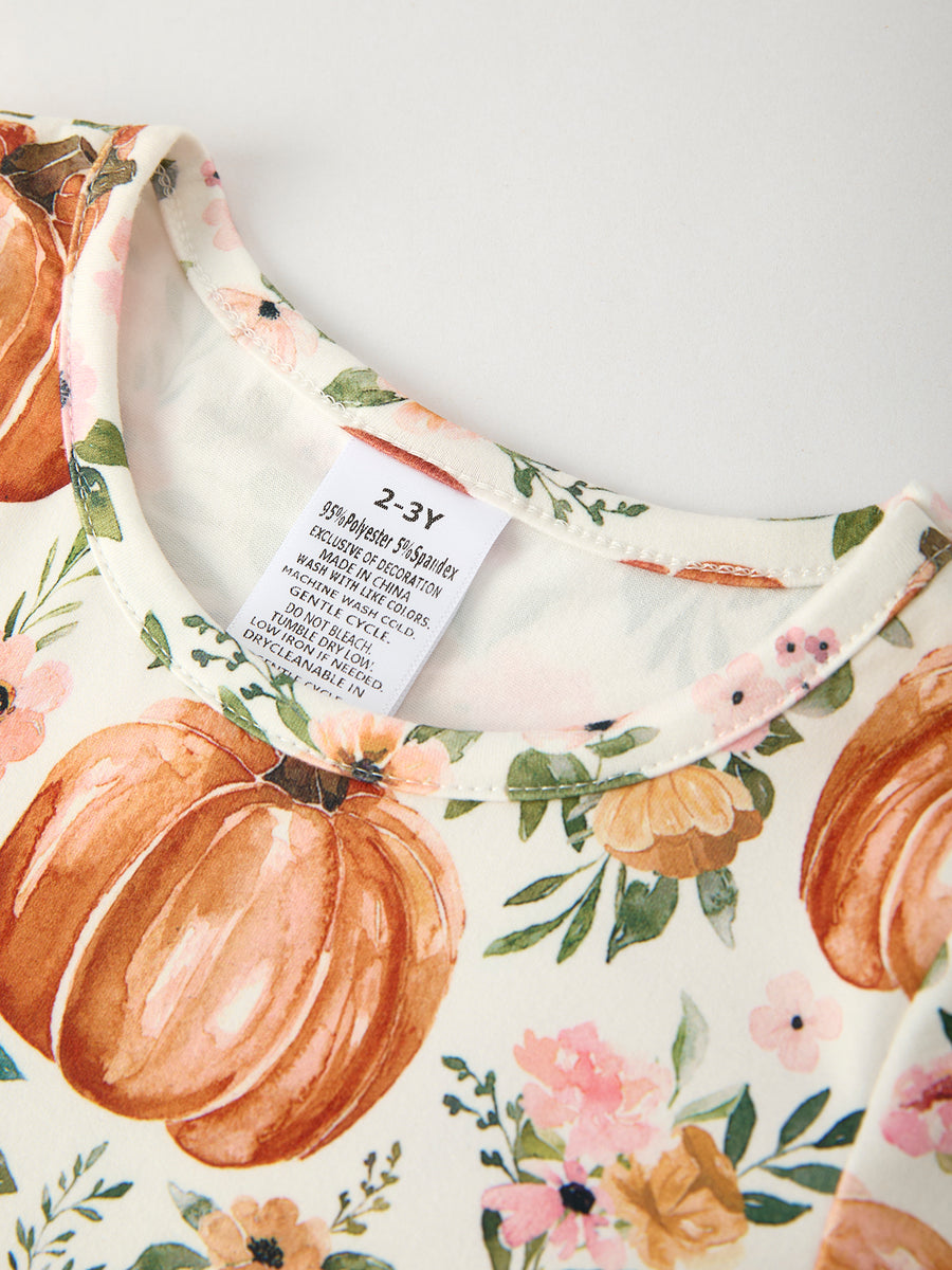Fall Thanksgiving & Halloween Pumpkin Floral Print Long Sleeve Dress(2pcs)