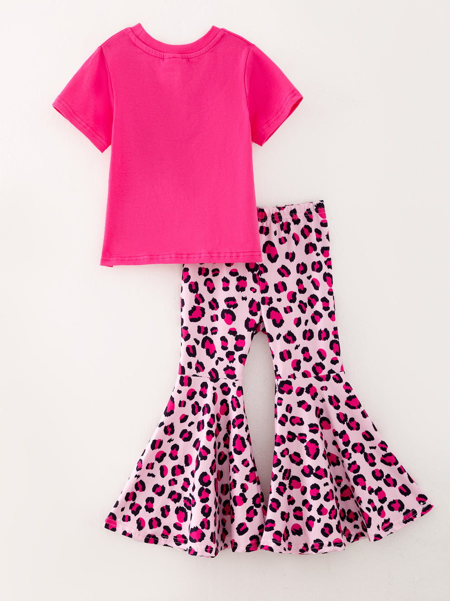 Girls Hot pink "ATTITUDE" Letter Print Top + Leopard Print Flared Pants