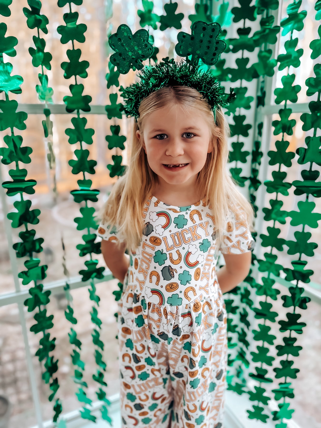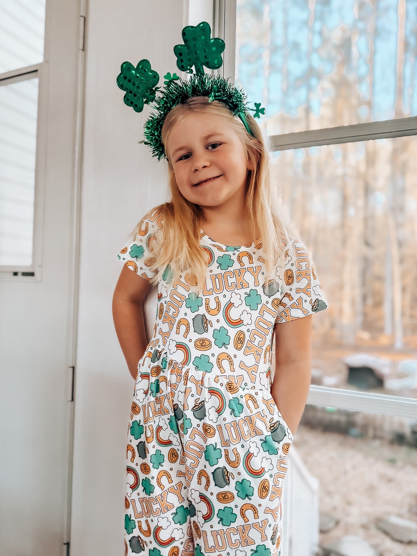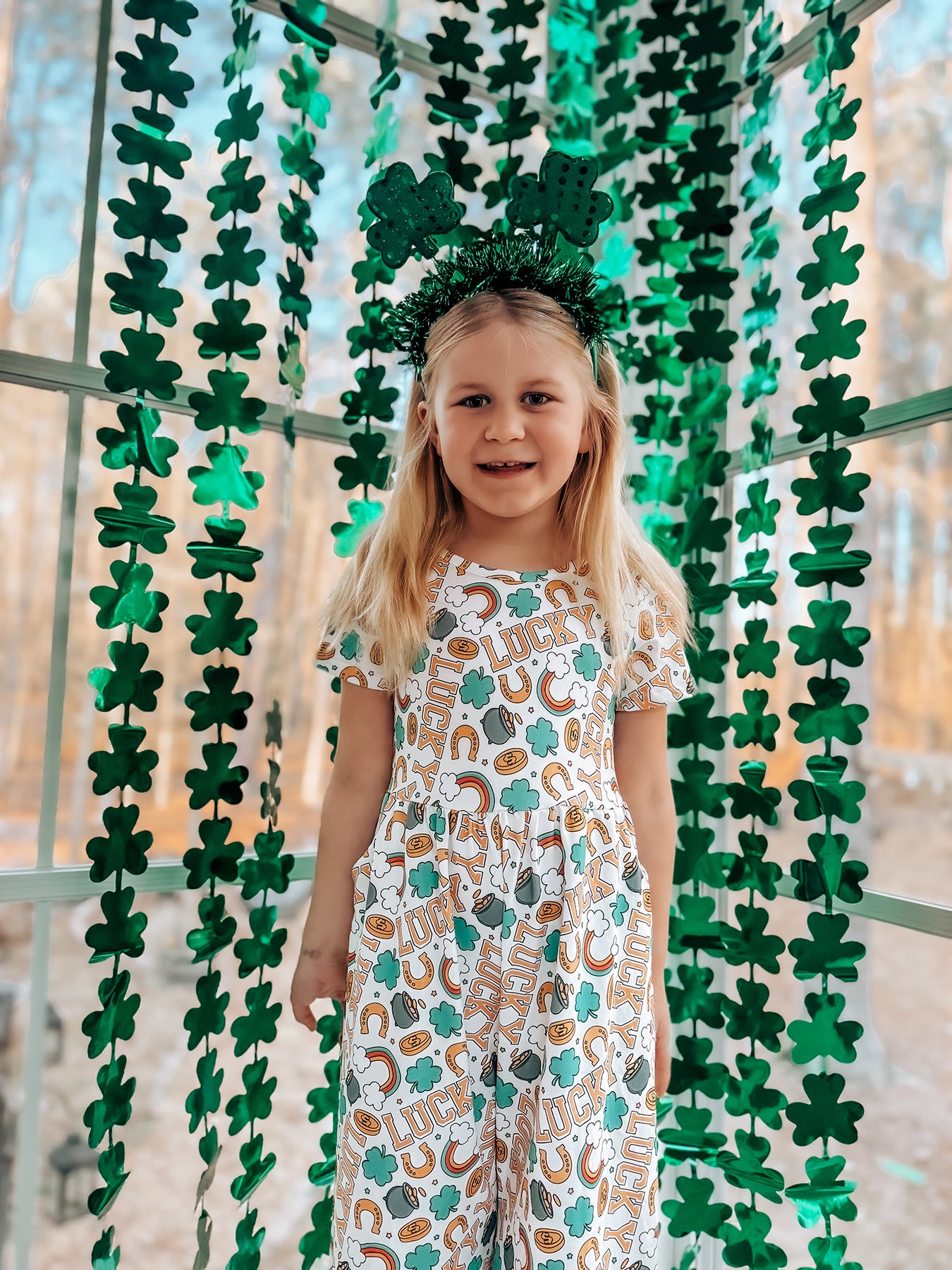 # St Patrick's Day Shamrock Girl Jumpsuit Celebrate the season in festive style with this charming St. Patrick's Day jumpsuit designed for girls. Featuring playful shamrock details, this one-piece outfit combines comfort with holiday spirit, making it perfect for parades, parties, and family gatherings. The easy-to-wear jumpsuit design eliminates outfit coordination while keeping your little one looking adorable and festive. Ideal for creating memorable photos and spreading St. Patrick's Day cheer from morning through evening.