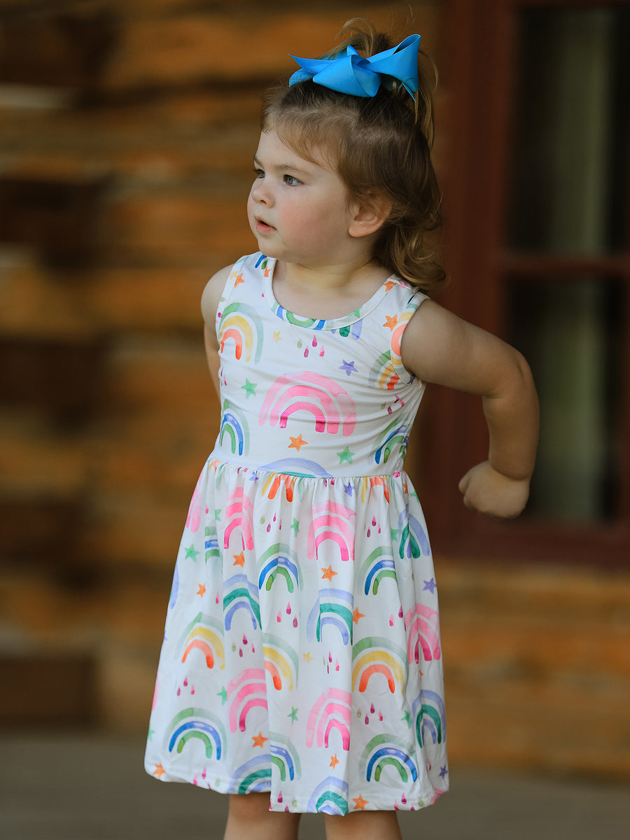 Experience the magic of rainbows and stars with our Rainbow Star Colorful 3-Piece Dress Set. Made with vibrant colors and a playful pattern, this set is sure to make your little one stand out. Perfect for any occasion, it's a must-have for any stylish kid's wardrobe.