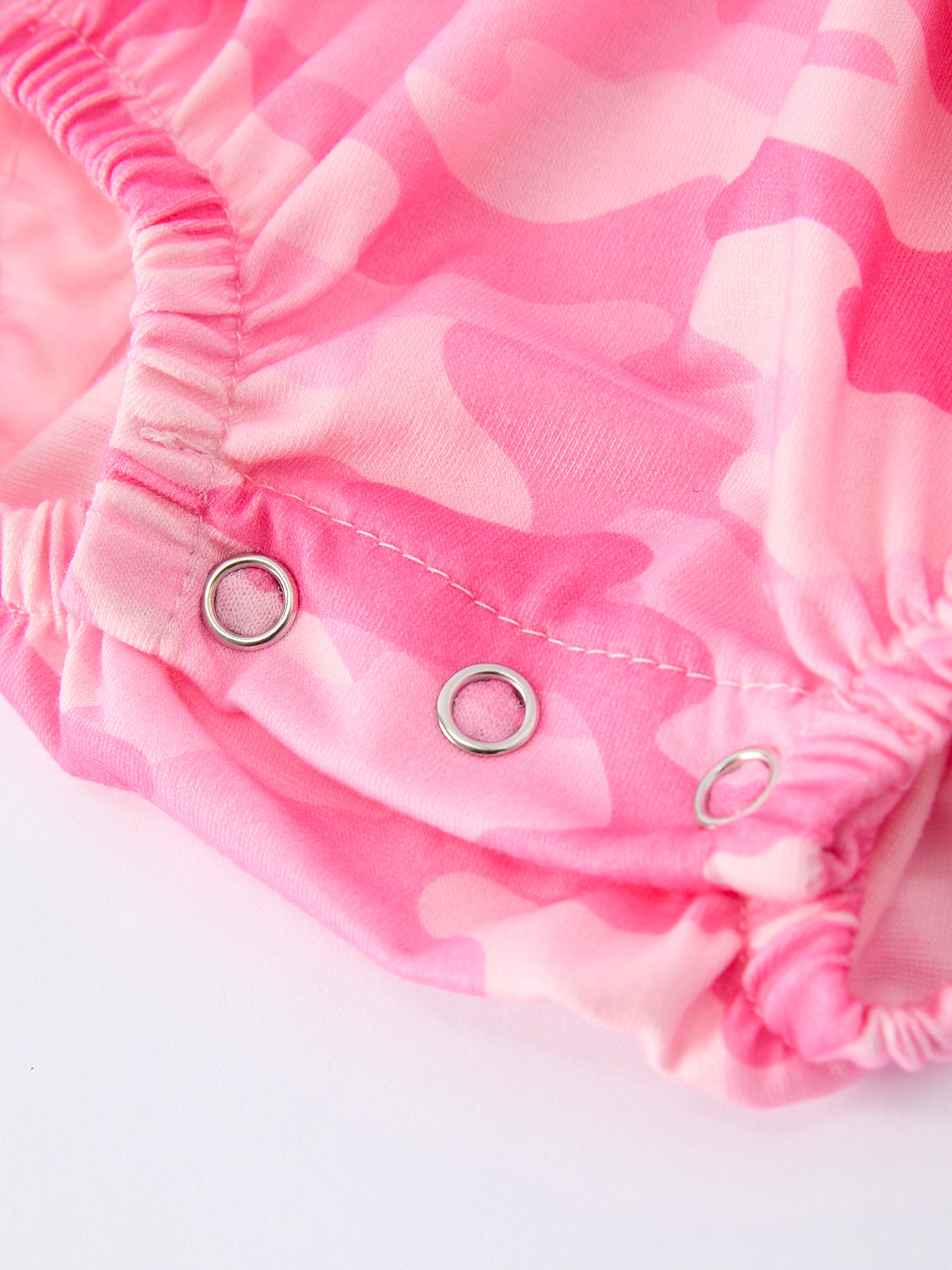 Introduce your little one to comfort and style with this charming camouflage romper, featuring delicate smocking embroidery and an adorable "DADDY'S GIRL" design. Perfect for casual outings or special occasions, the soft fabric moves with active play while the classic camo pattern adds a trendy edge. The smocking detail at the bodice creates a flattering fit that grows with your daughter, making it a versatile wardrobe staple. Ideal for parents who want their child looking effortlessly put-together.