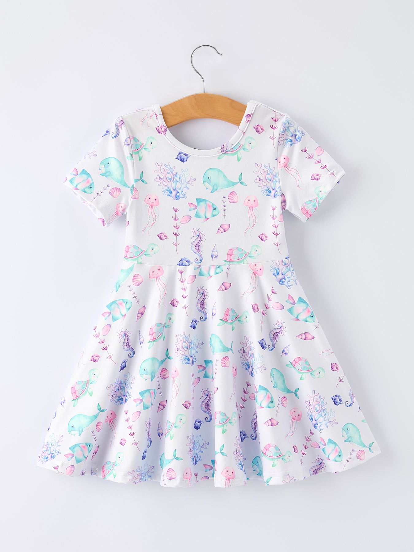 # Summer Sea Life Print Girl Dress Dive into summer style with this charming sea life print dress designed for active little ones. Featuring vibrant ocean-inspired graphics, soft breathable fabric, and a playful silhouette that moves with your child, this dress is perfect for warm-weather adventures—from beach days to casual outings. The cheerful sea creature motifs spark imagination while the comfortable fit keeps her cool and happy all day long. An essential addition to any toddler's warm-weather wardrobe.