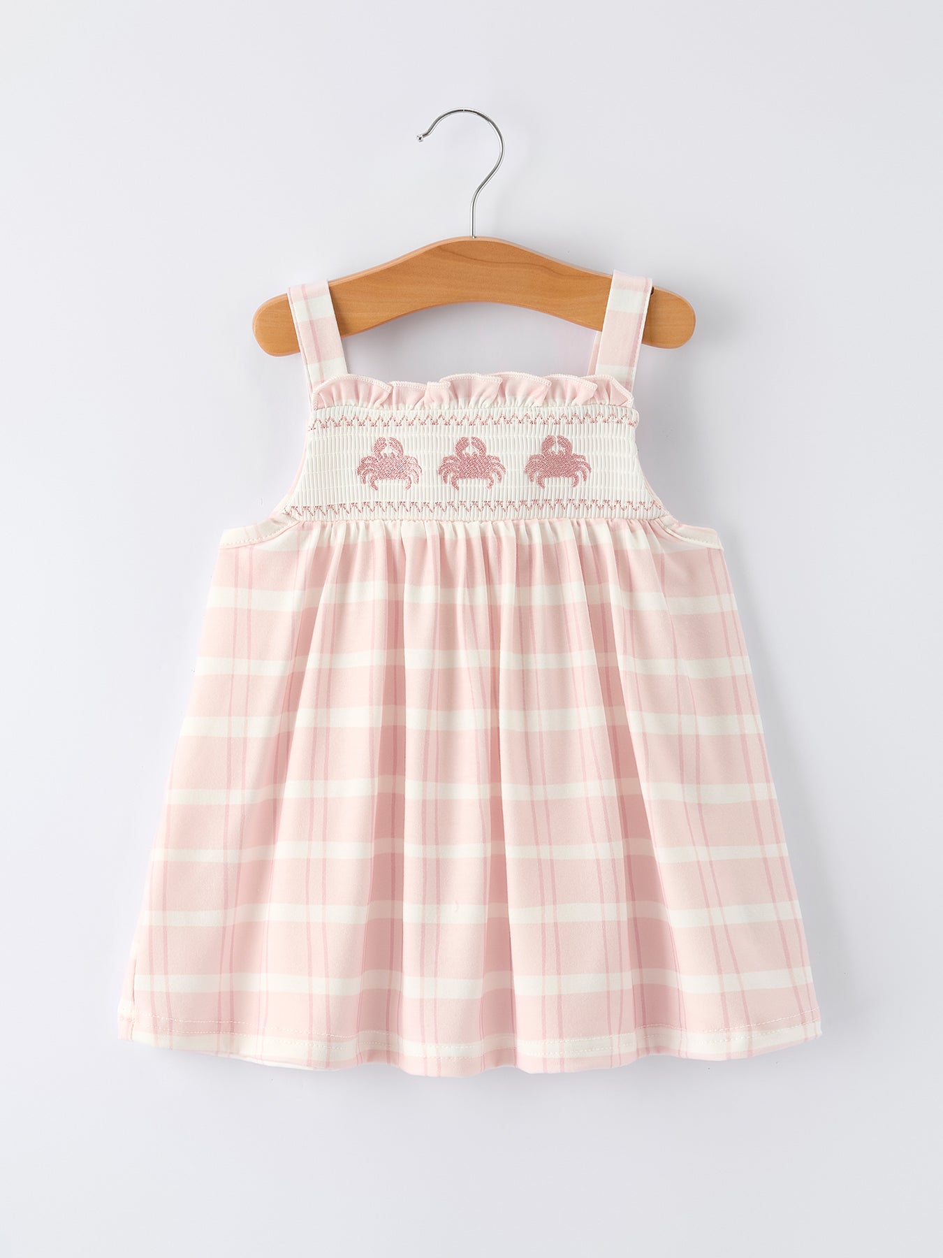 # Girls Crab Embroidered Smocked Dress Adorable coastal charm meets timeless elegance in this girls' smocked dress, featuring an intricate crab embroidery that captures seaside whimsy. The classic smocking detail creates a flattering, comfortable fit that grows with your daughter, while the quality construction ensures this piece becomes a wardrobe favorite for beach days, family gatherings, and special occasions. Perfect for parents seeking charming, durable pieces that blend playful design with everyday wearability.