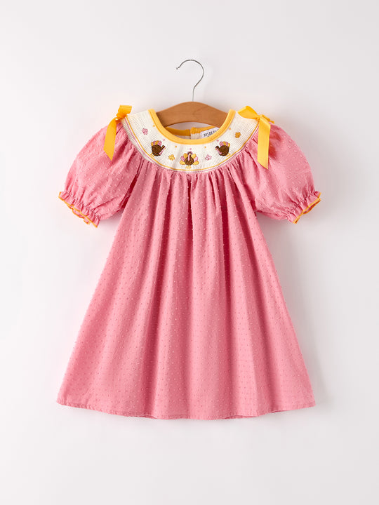 Fall Thanksgiving Turkey Leaf Embroidery Smocking Bow Girls Dress