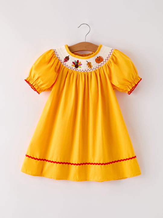 Fall Halloween & Thanksgiving Turkey Nuts Smock Embroidered Yellow Girls Dress