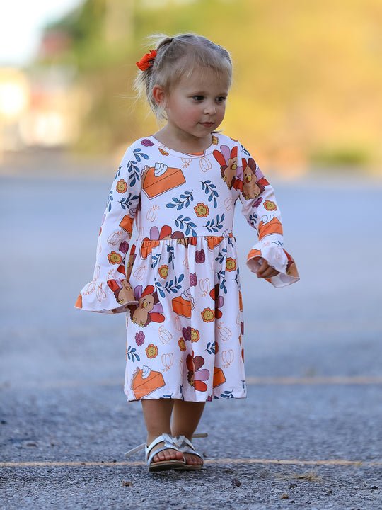 Thanksgiving Day Vintage Fall Pumpkin and Turkey Print Long Sleeve Dress
