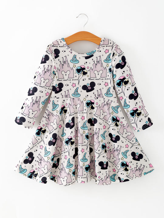 Valentine's Day Girls Castle Character Print Long Sleeve Dress