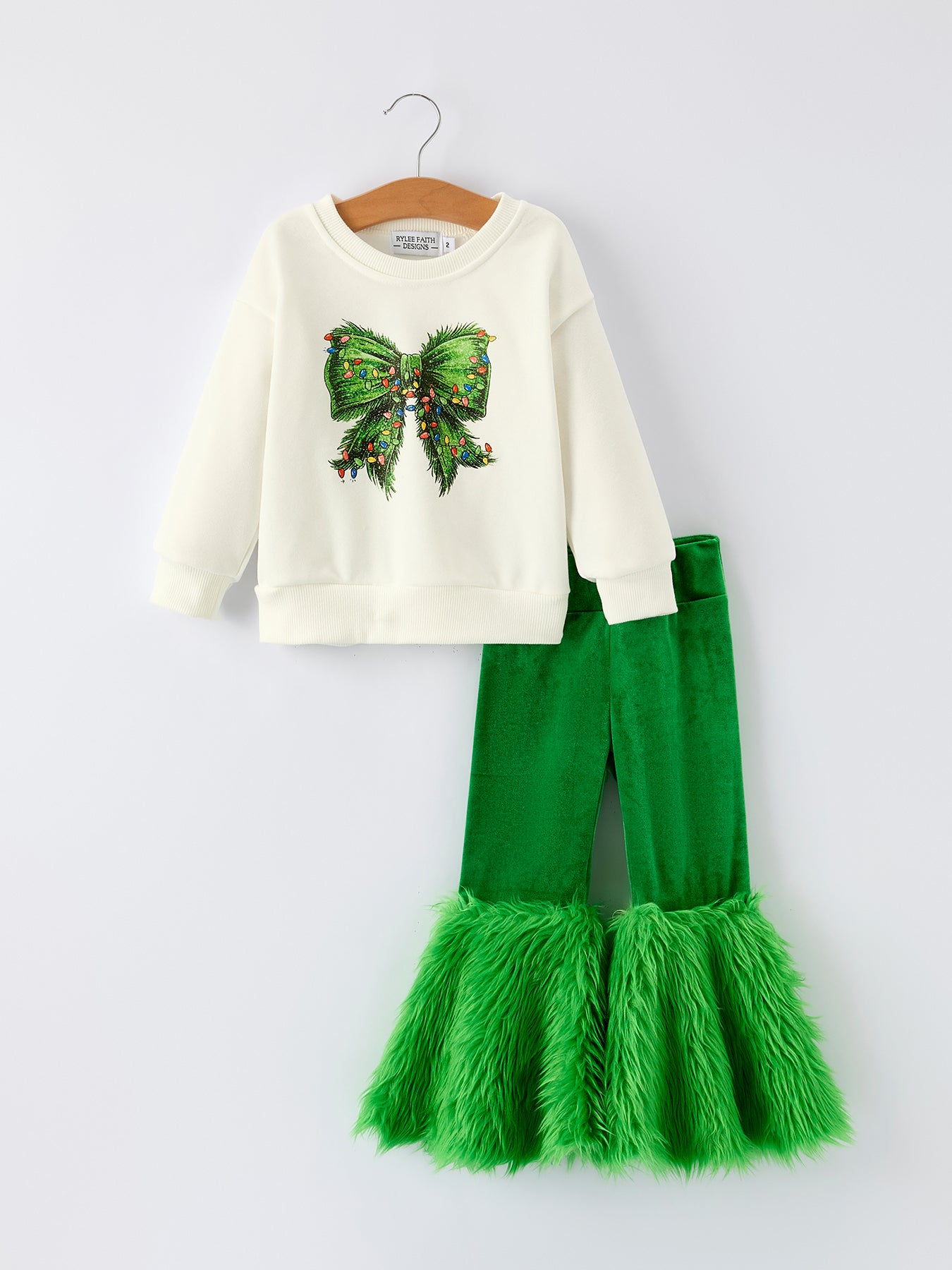 Mommy & Me Christmas Bow Print Girls Outfit with Green Furry Bell Bottoms