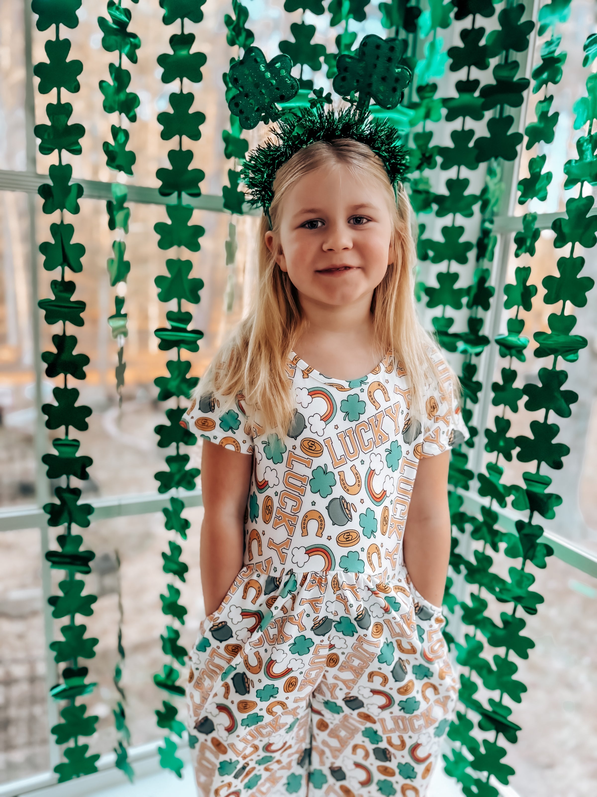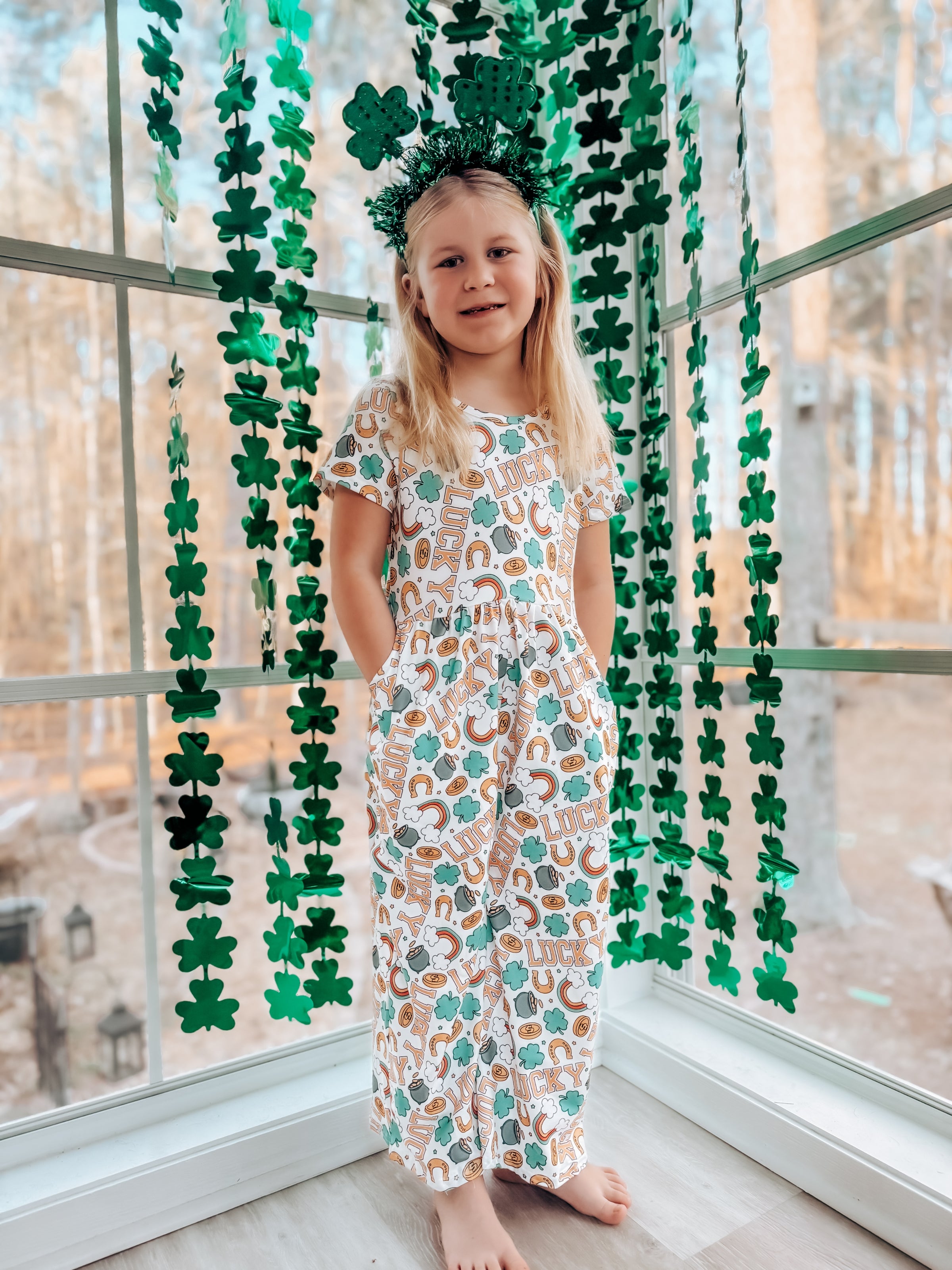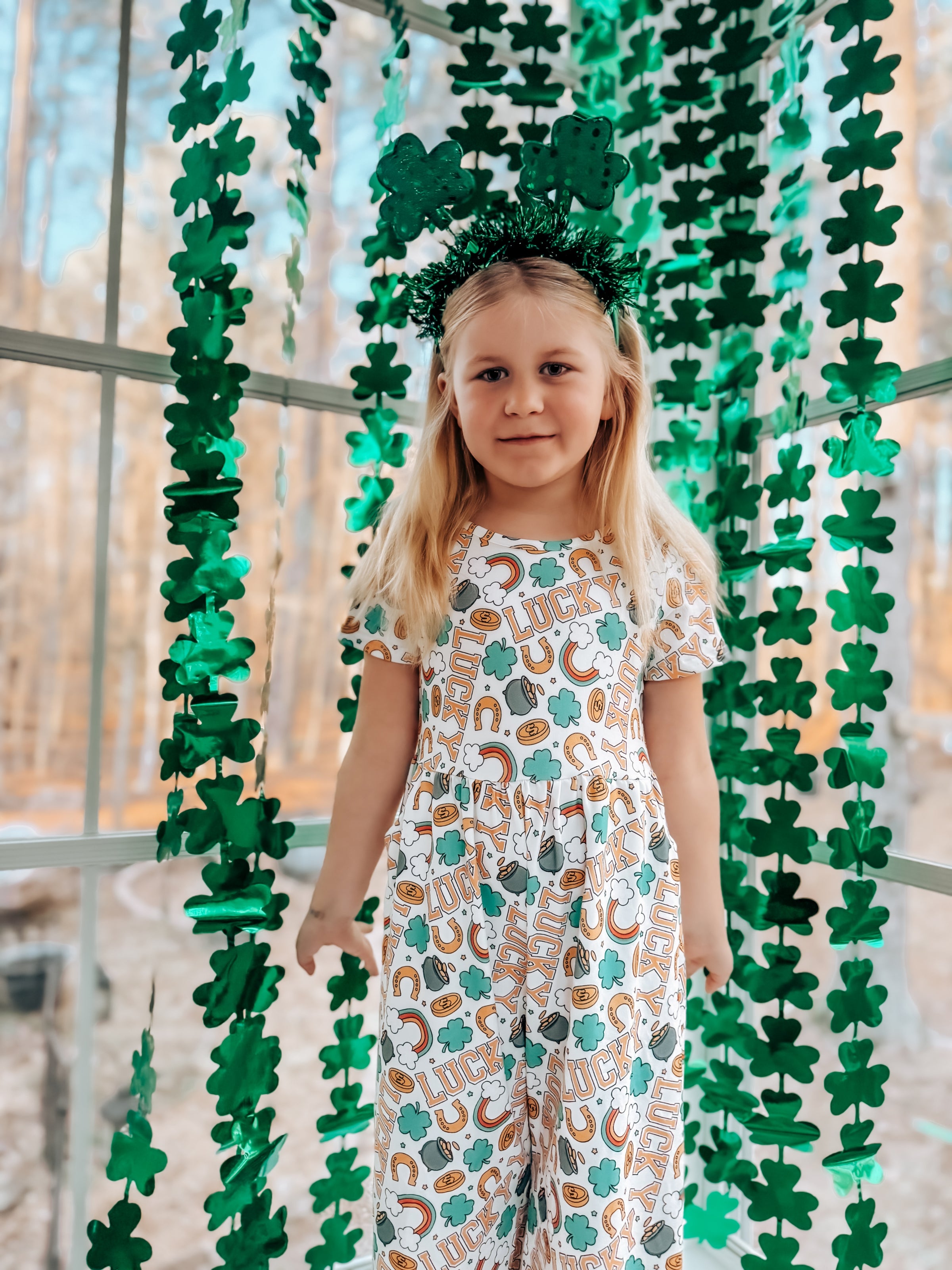 # St Patrick's Day Shamrock Girl Jumpsuit Celebrate the season in festive style with this charming St. Patrick's Day jumpsuit designed for girls. Featuring playful shamrock details, this one-piece outfit combines comfort with holiday spirit, making it perfect for parades, parties, and family gatherings. The easy-to-wear jumpsuit design eliminates outfit coordination while keeping your little one looking adorable and festive. Ideal for creating memorable photos and spreading St. Patrick's Day cheer from morning through evening.