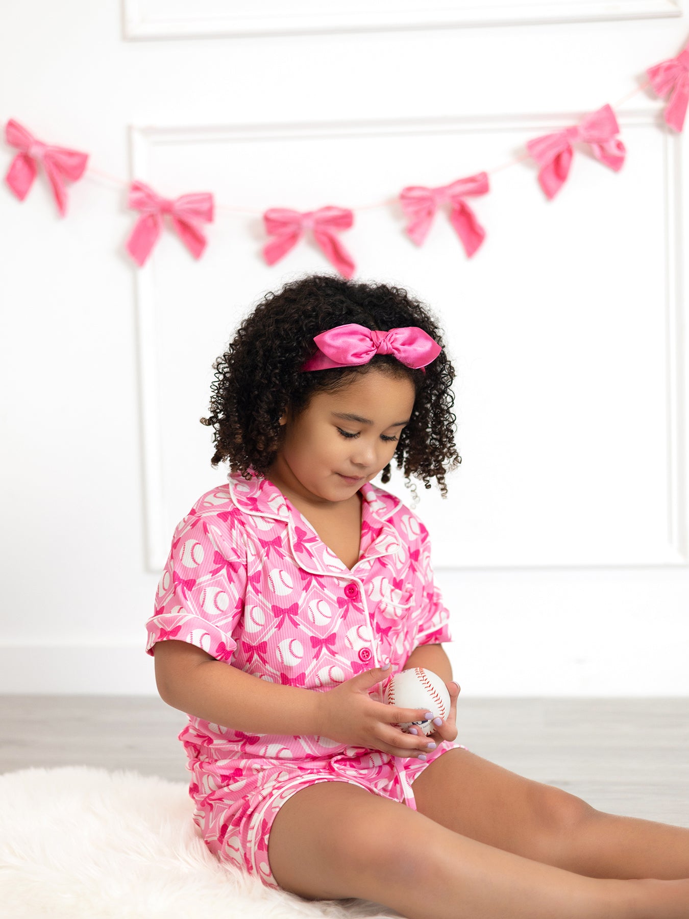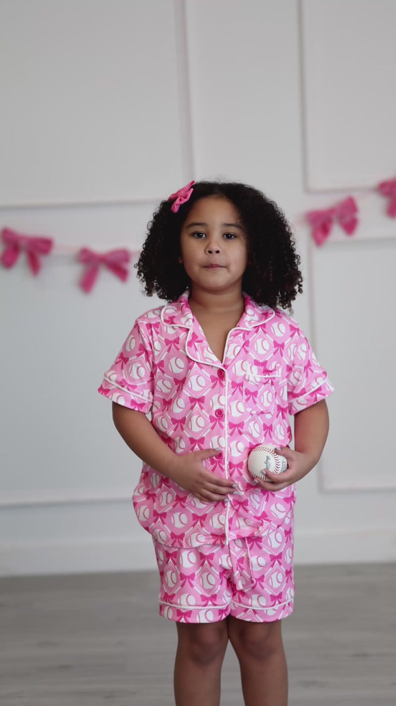 Girls Baseball Bow Print Pajama Set Short Sleeve Pink