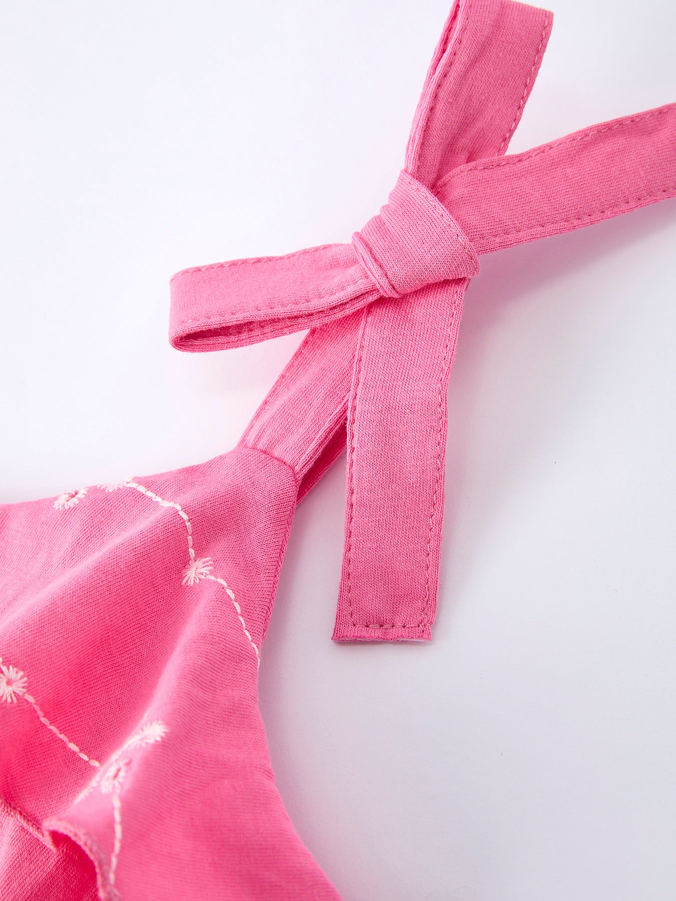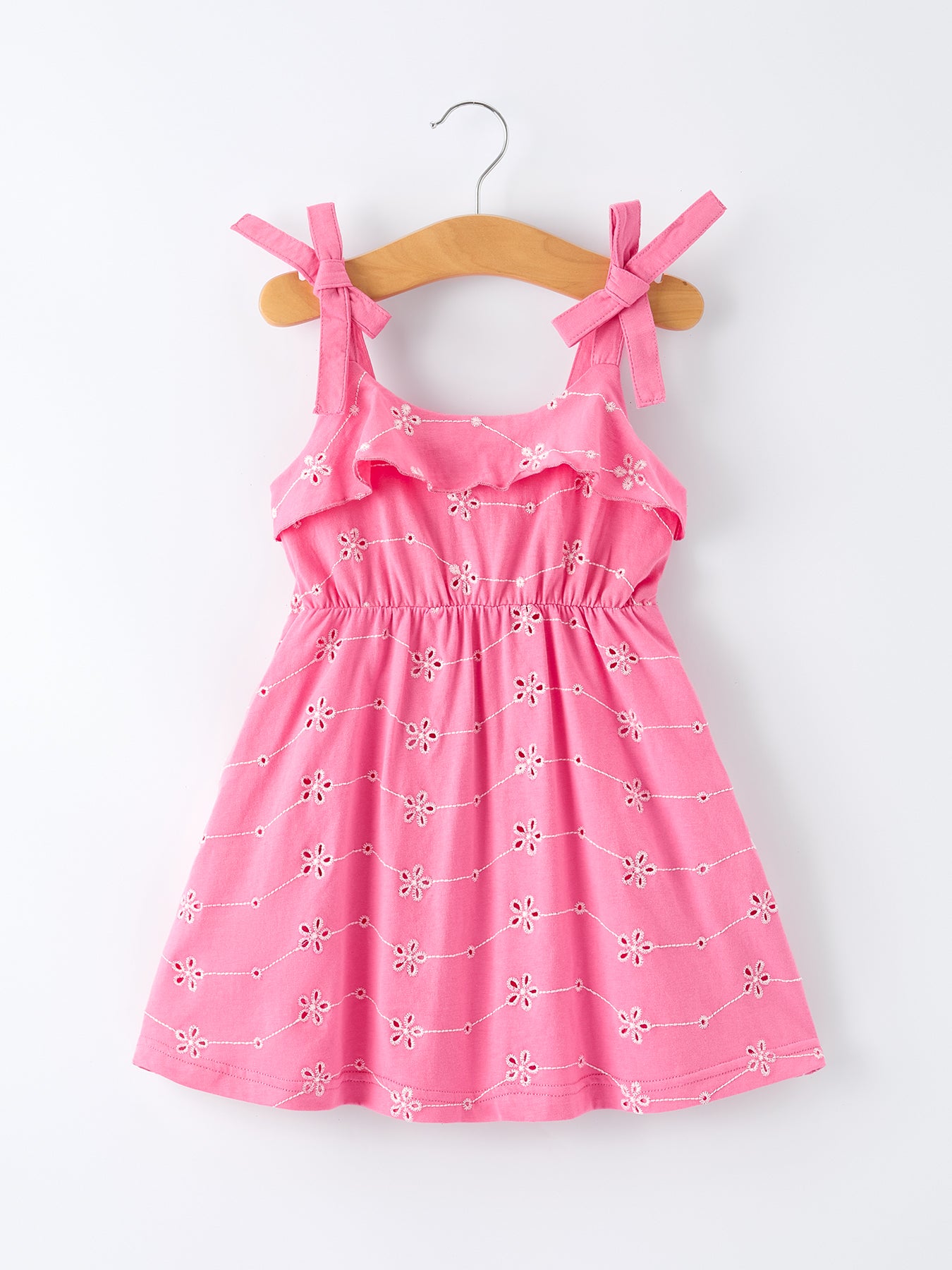 # Pink Color Girl Bow Strap Ruffle Dress Twirl in style with this charming pink ruffle dress designed for little ones who love to make a statement. Delicate bow straps add a touch of elegance while the playful ruffled details create movement and dimension with every step. The soft pink hue is perfect for everyday wear, special occasions, or photo-worthy moments. Crafted with comfort in mind, this dress lets your daughter express her personality while staying effortlessly put-together. A wardrobe essential that grows with her confidence.