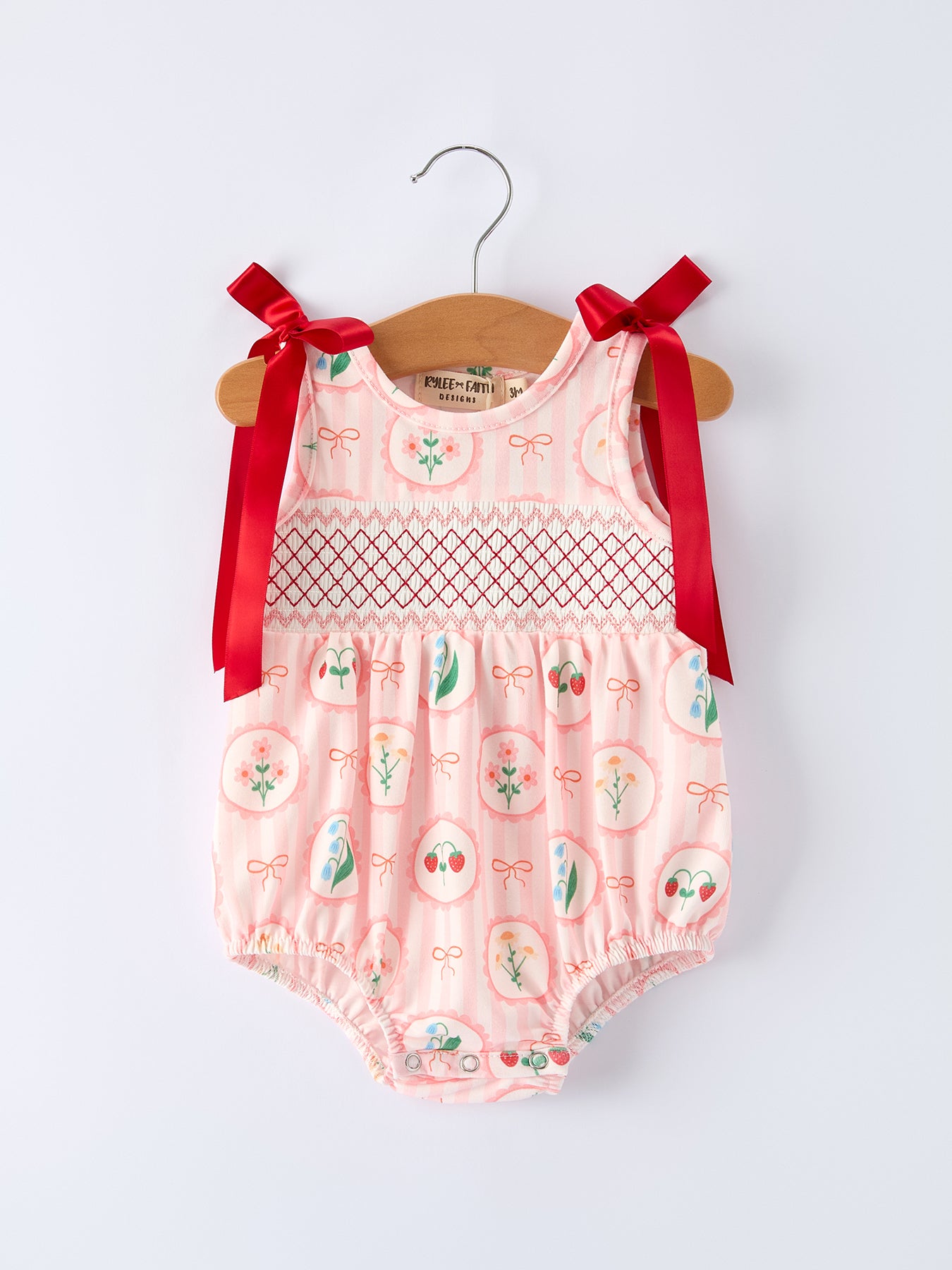 Introduce your little one to effortless spring style with this charming pink floral romper. Delicate smocking across the bodice creates timeless texture and visual interest, while the coordinating bow detail adds a playful finishing touch. Soft, breathable fabric keeps her comfortable through warm days and playtime adventures. The one-piece design simplifies dressing without sacrificing that premium, polished look Rylee Faith Designs is known for. Perfect for photos, special occasions, or everyday wear that feels just a little bit special.