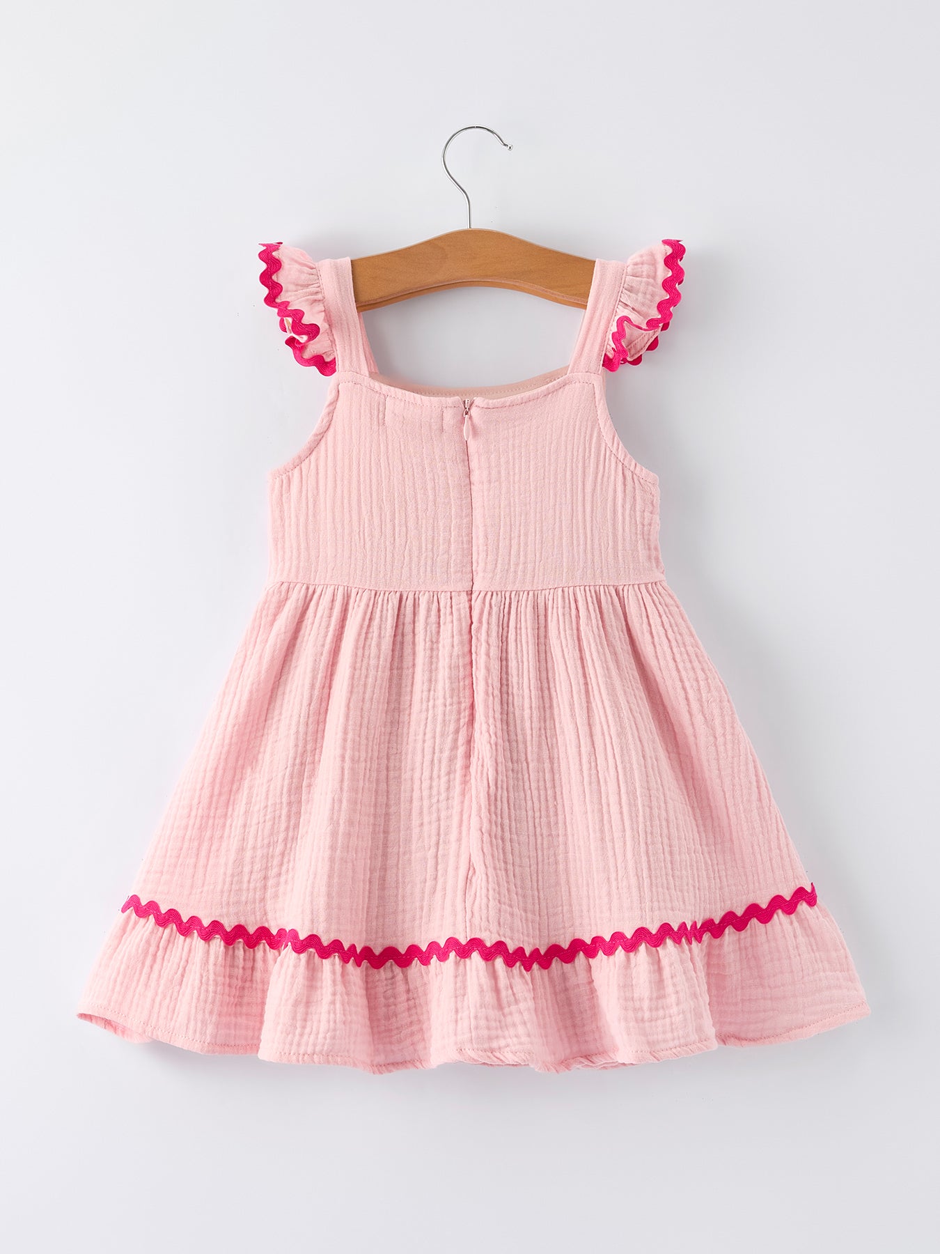 Twirl into summer in this charming pink ruffle trim dress designed for little girls who love to play and shine. Crafted with soft, breathable fabric perfect for warm weather adventures, the delicate ruffle detailing adds a touch of whimsy and movement with every step. Whether she's heading to a birthday party, family gathering, or casual outing, this dress combines comfort with effortless style. Easy to care for and built to last through countless memories, it's the go-to piece every girl's wardrobe needs this season.